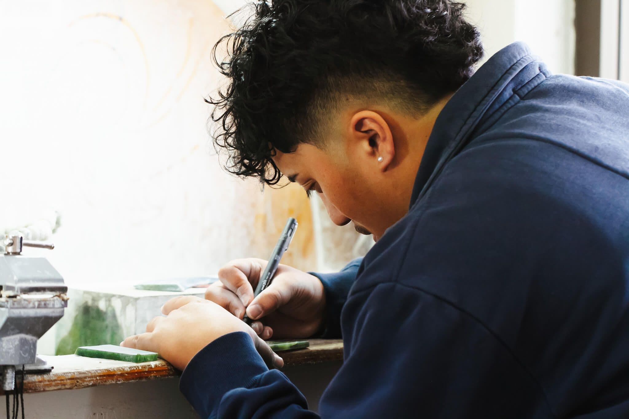 One of this years artist's Daniel Malcolm (above) works on sketching the pounamu toki outlines, before carving.