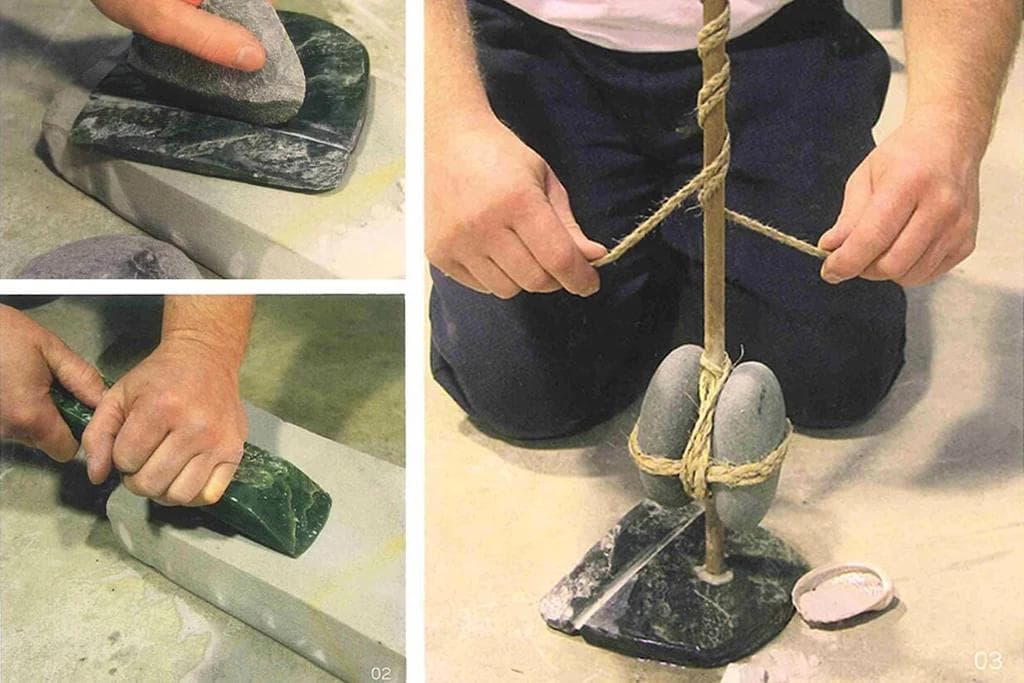 With a large wooden hammer Māori would hit smaller fragments of jade from the larger mass down pre-cut grooves. To make sure the fragments broke from the larger mass in the desired direction, large grooves were cut into the jade by rubbing sections with an abrasive quartz rich mica schist. Quartz is harder than jade (Quartz 7, Jade 6.5) therefore rubbing slowly wore grooves into the piece of jade. Māori would rasp grooves on opposing sides of the boulder using the abrasive method. When the grooves were close to meeting in the middle, one side of the boulder would be hit and it would snap down the groove.