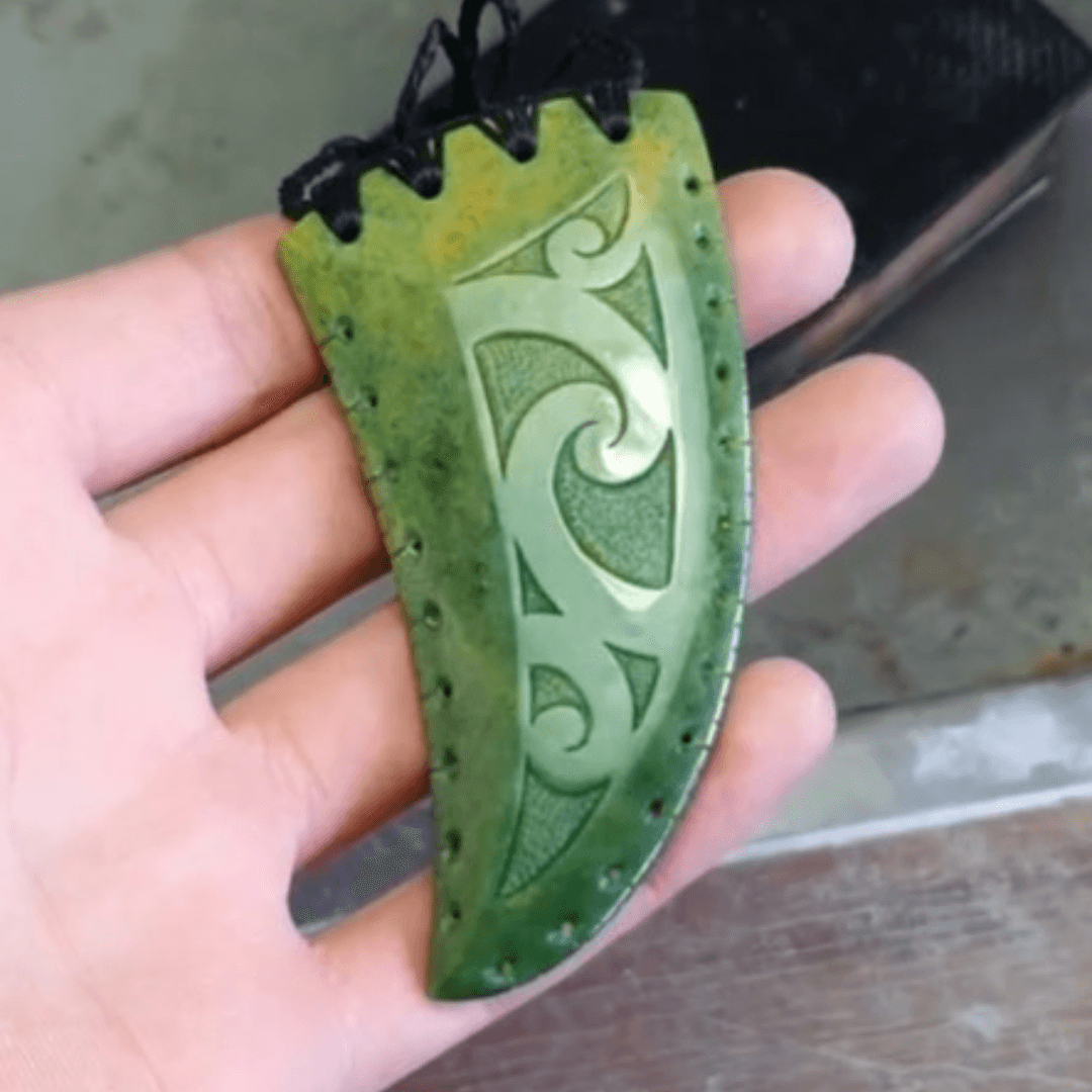 Sometimes our artists incorporate notched edges down the sides of their designs. Not only does this detail add to the beauty and intricacy of the piece, but it is also symbolic of whakapapa (genealogy) and represents the line of descent from one's tīpuna (ancestors).