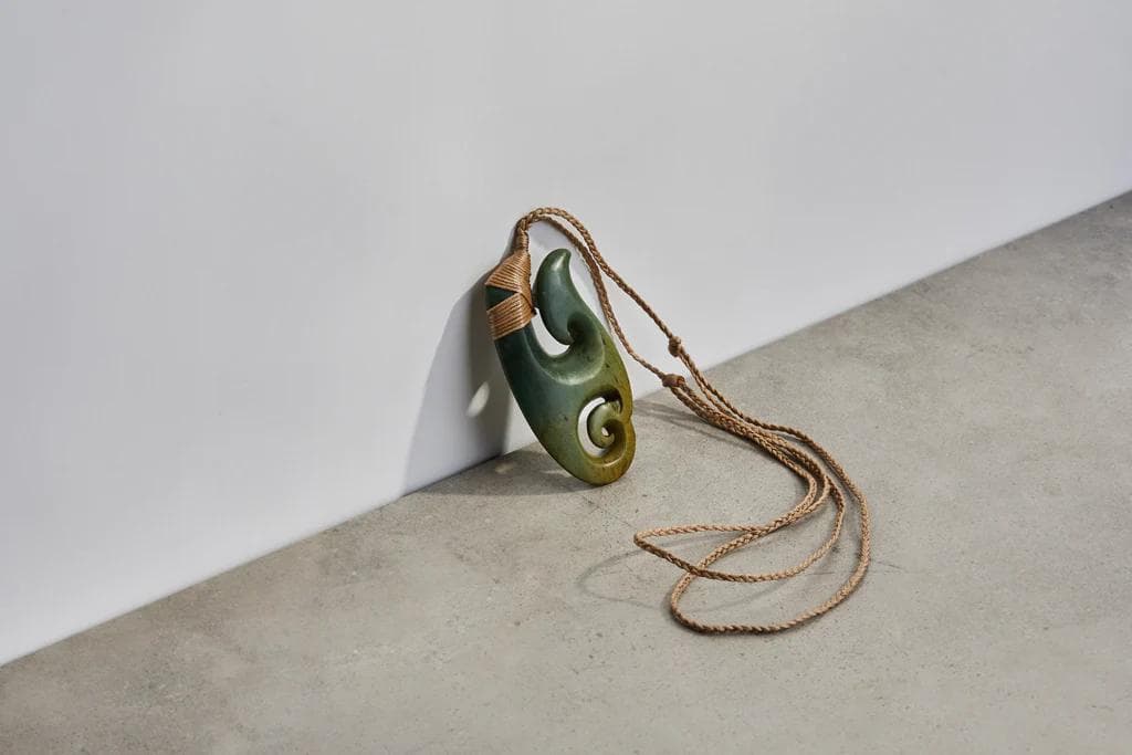 This Mountain Jade koru hook necklace is carved out of New Zealand flower jade, or pounamu.