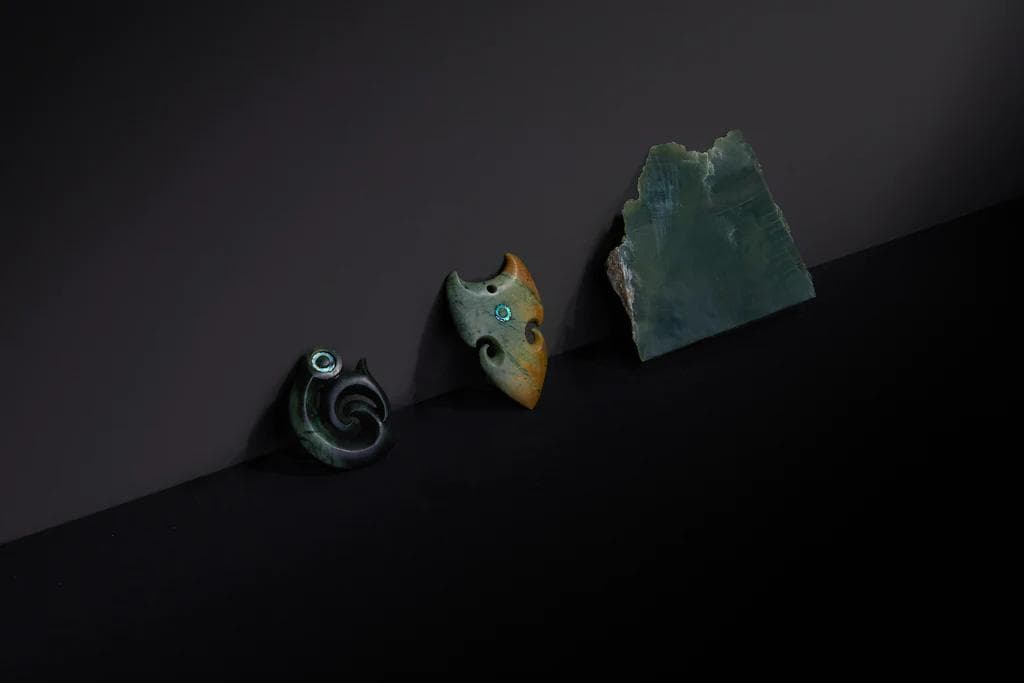 The koru tooth necklace (pictured above, middle) has what gemologists would refer to as iron oxides tinting - they’re compounds in the grain of the mineral giving the pounamu a beautiful deep ochre vein down its right-hand side. The koropepe necklace features a paua shell eye that compliments the deep ocean green pounamu. Our master carvers look to these colours and textures when making decisions surrounding the design of each piece. Here, our master carver has chosen to accentuate certain aspects of the design with the natural details of the raw material. The carving process can be thought of as a relationship between the raw material and the carving design, each informing one another.